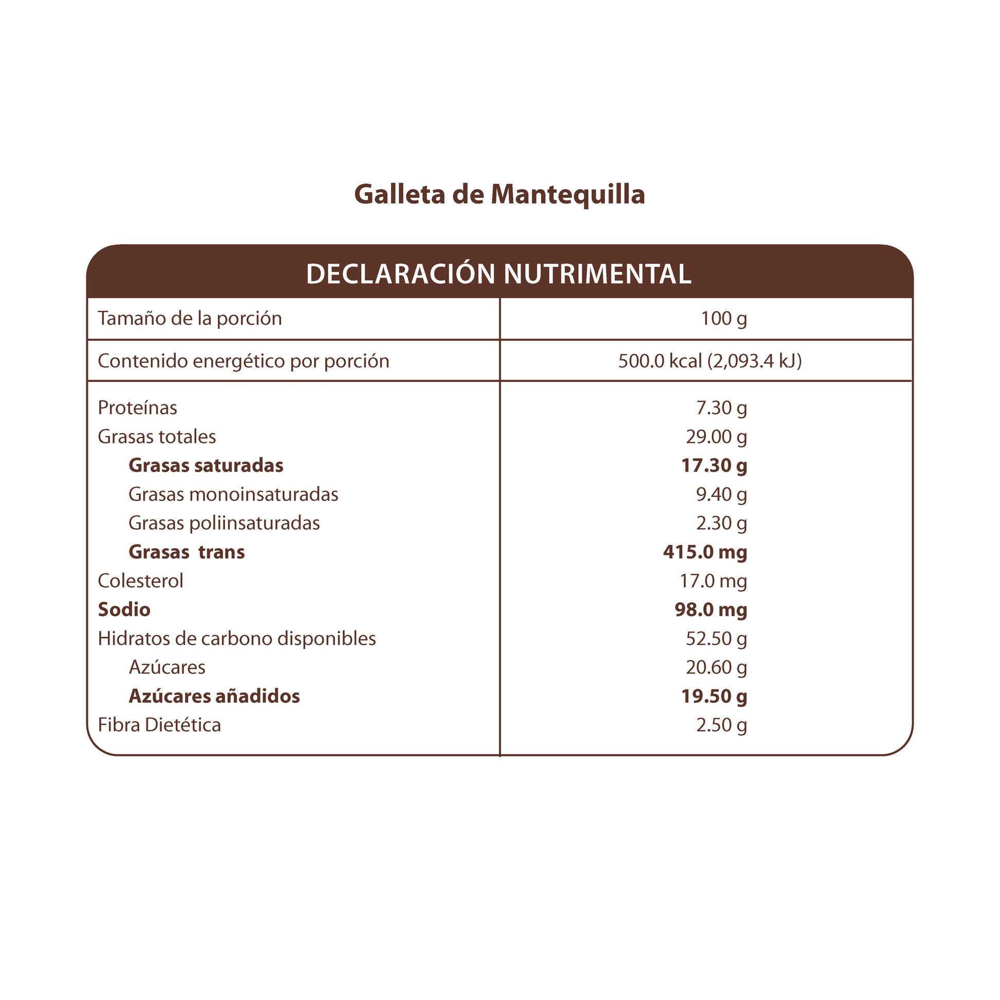 Harina de trigo, azúcares añadidos (azúcar, fructosa), mantequilla, huevo, cocoa, nuez, almendra, relleno y cobertura sabor chocolate (azúcares añadidos (azúcar), aceite vegetal no hidrogenado, cocoa, maltodextrina, harina de algarrobo, lecitina de soya (emulsificante) y extracto natural de vainilla), chispas de chocolate (azúcares añadidos (azúcar, dextrosa), leche entera en polvo, manteca de cacao procesada con álcali, grasa butírica (leche), lecitina de soya (emulsificante), extracto natural de vainilla), mermelada y saborizante artificial.