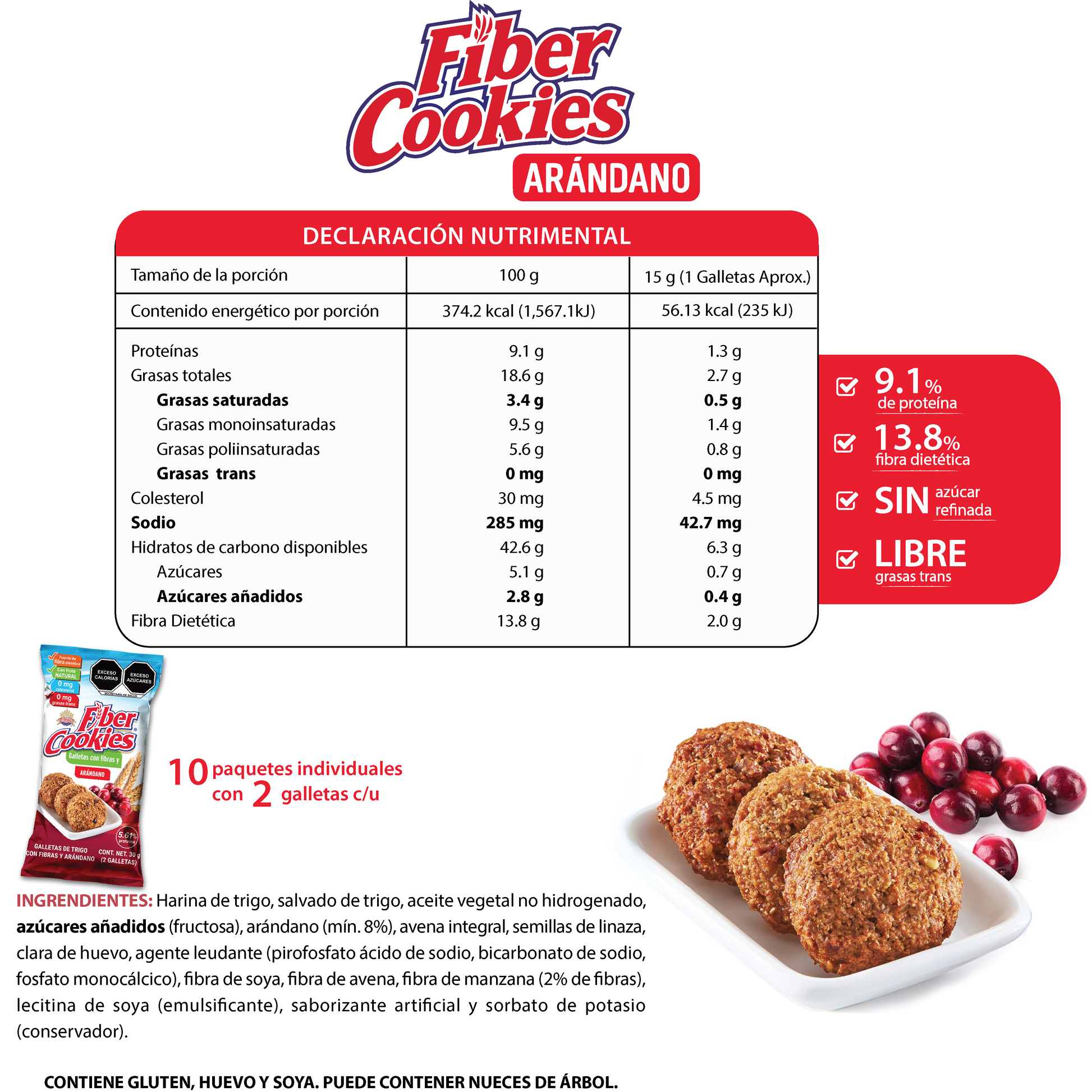 Harina de trigo, salvado de trigo, aceite vegetal no hidrogenado, azúcares añadidos (fructosa), arándano (mín. 8%), avena integral, semillas de linaza, clara de huevo, agente leudante (pirofosfato ácido de sodio, bicarbonato de sodio, fosfato monocálcico), fibra de soya, fibra de avena, fibra de manzana (2% de fibras), lecitina de soya (emulsificante), saborizante artificial, sorbato de potasio (conservador).