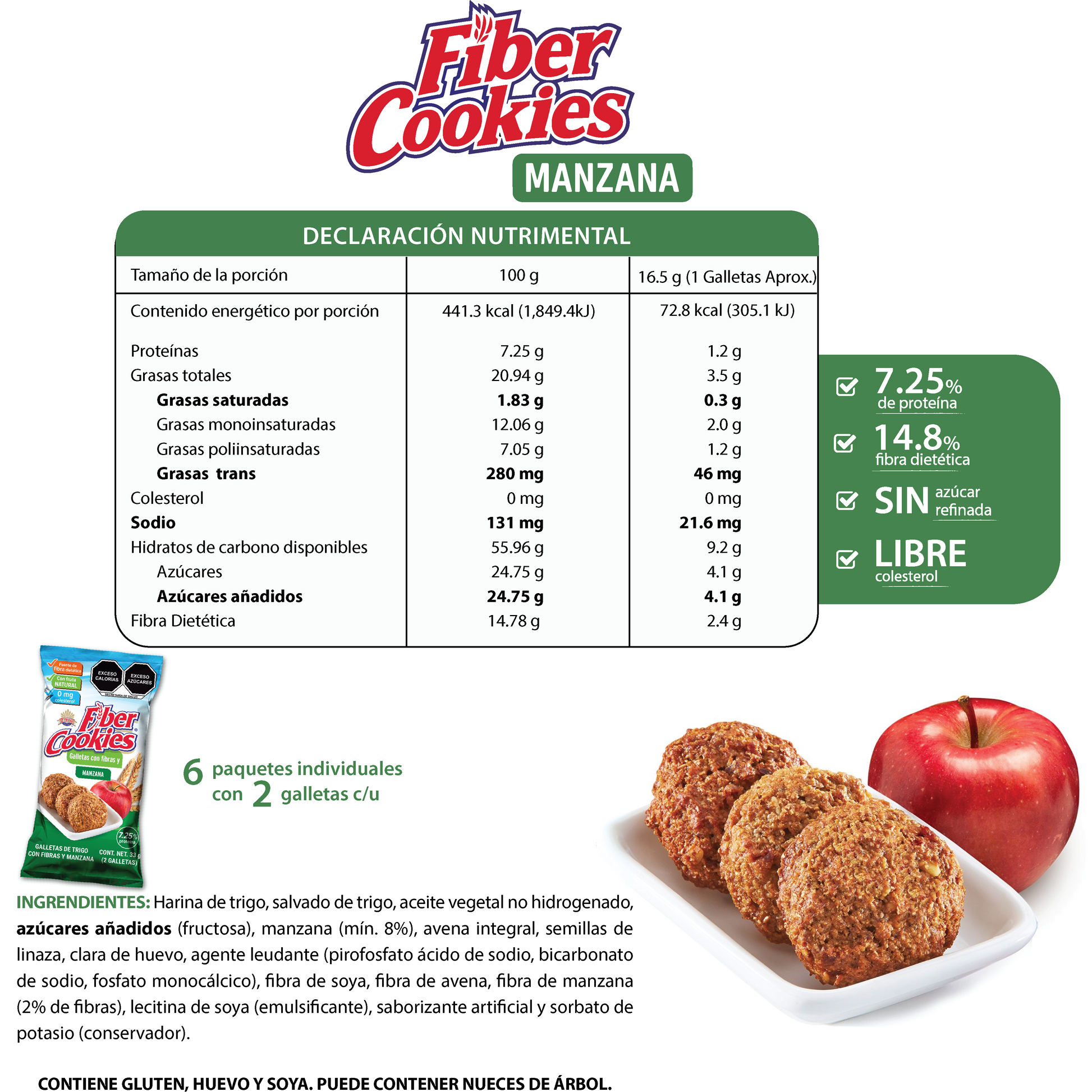 Harina de trigo, salvado de trigo, aceite vegetal no hidrogenado, azúcares añadidos (fructosa), manzana (mín. 8%), avena integral, semillas de linaza, clara de huevo, agente leudante (pirofosfato ácido de sodio, bicarbonato de sodio, fosfato monocálcico), fibra de soya, fibra de avena, fibra de manzana (2% de fibras), lecitina de soya (emulsificante), saborizante artificial, sorbato de potasio (conservador).